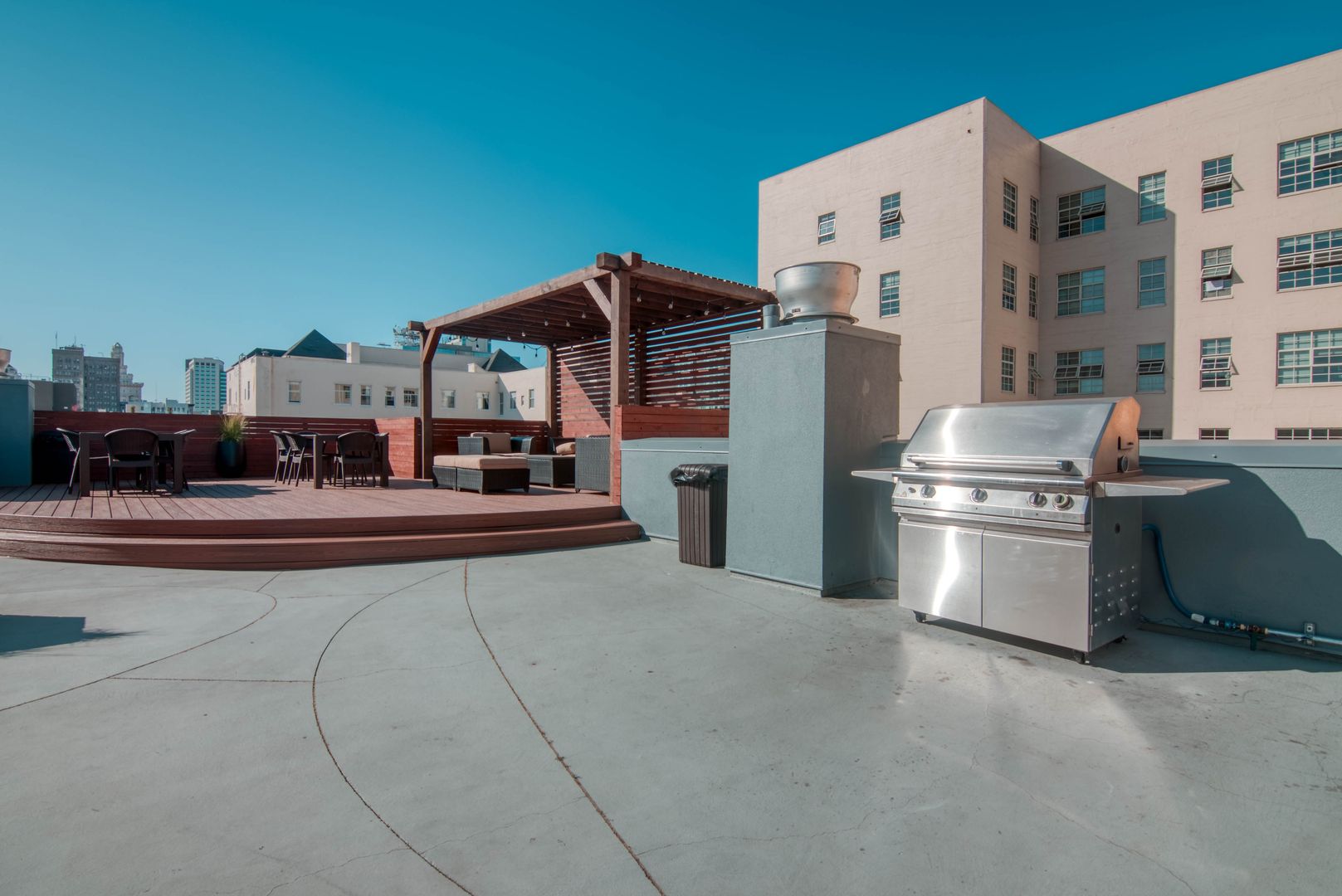- Rooftop sun deck and BBQ area with city views